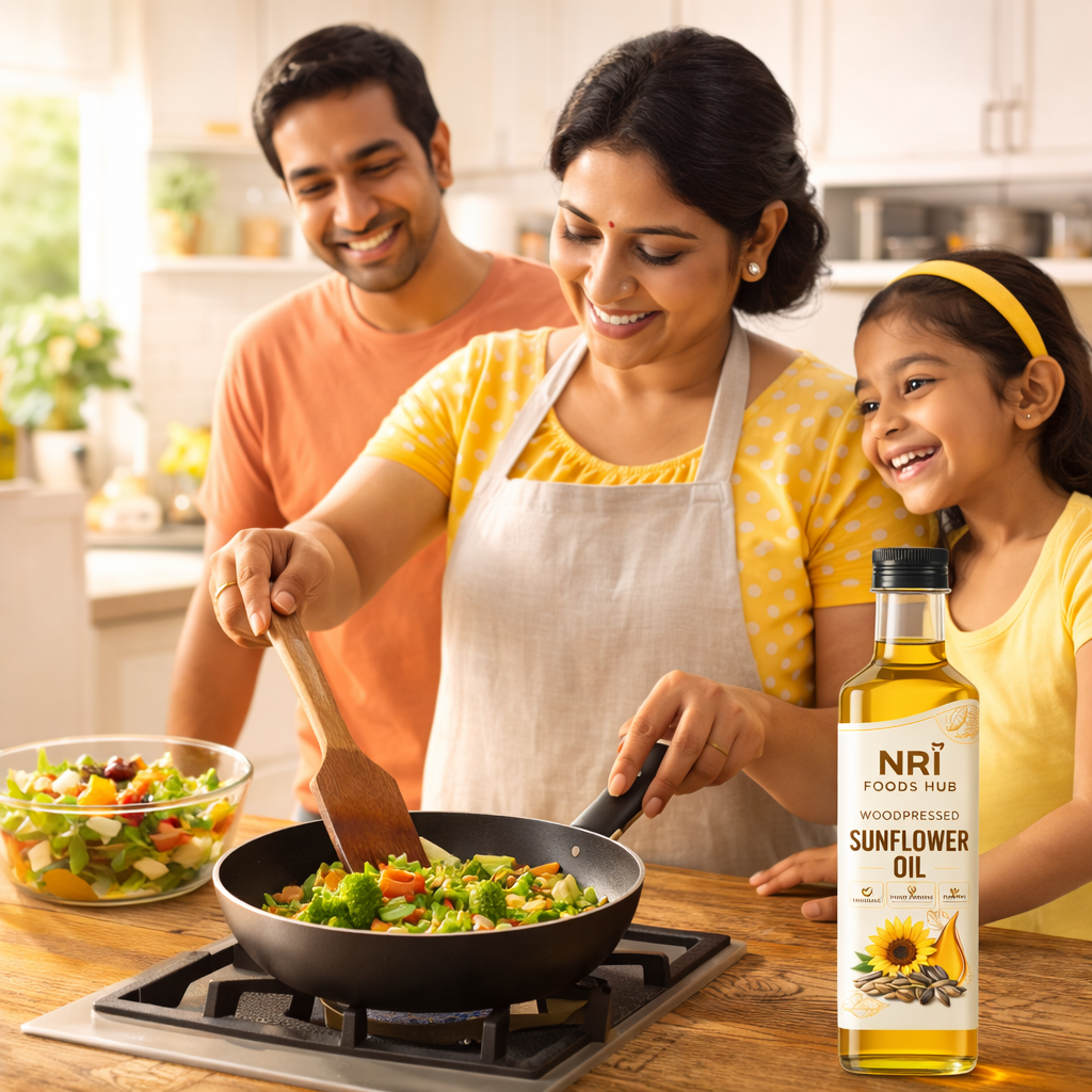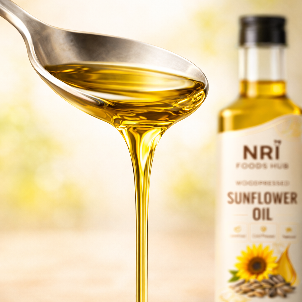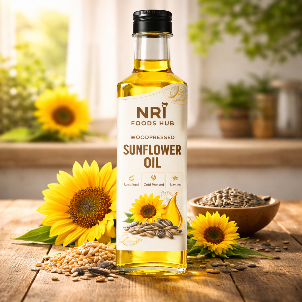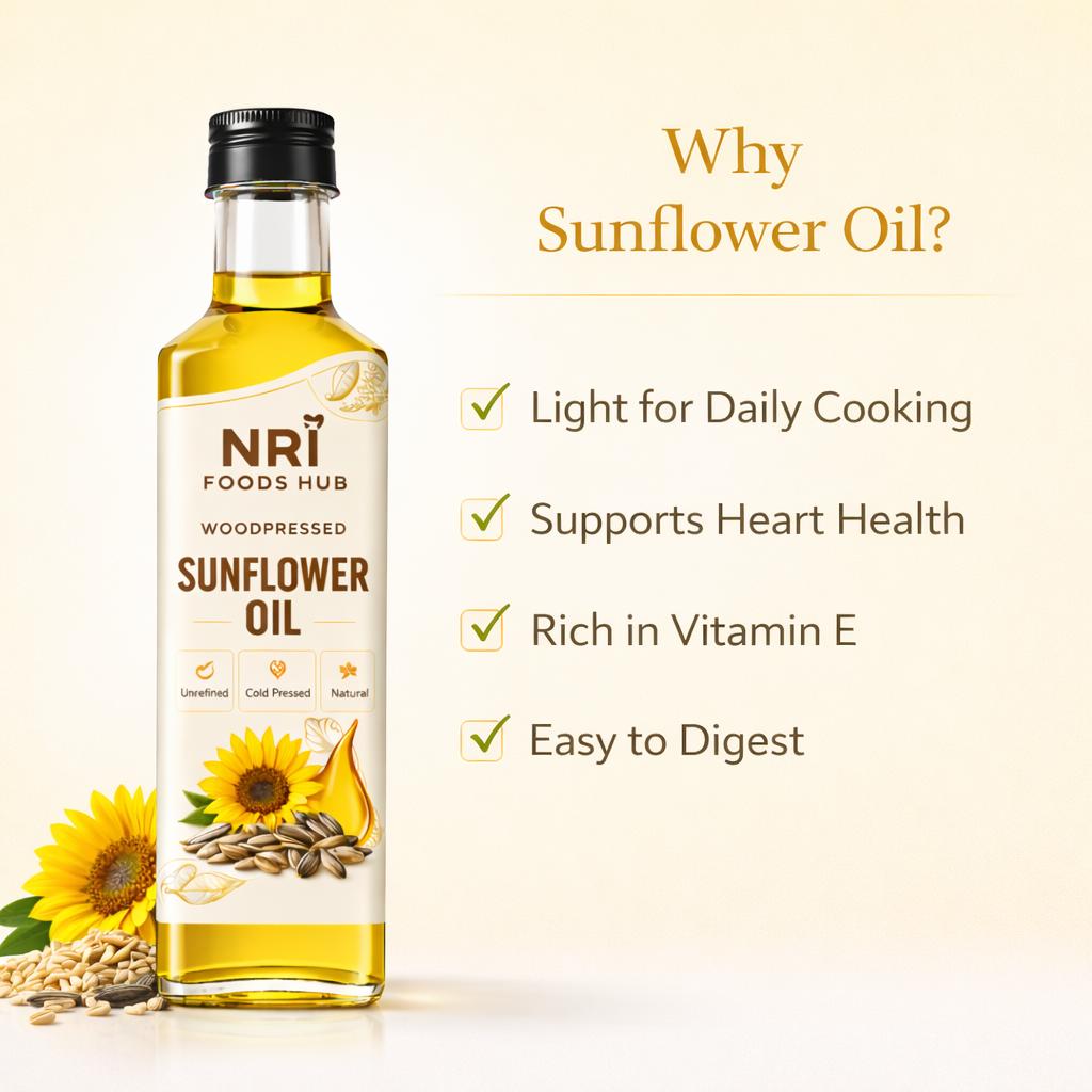 Our Wood Pressed Sunflower Oil is extracted from premium sunflower seeds using the traditional cold press (chekku) method. Unlike refined oils, it retains natural nutrients, making it a lighter, healthier choice for daily cooking.